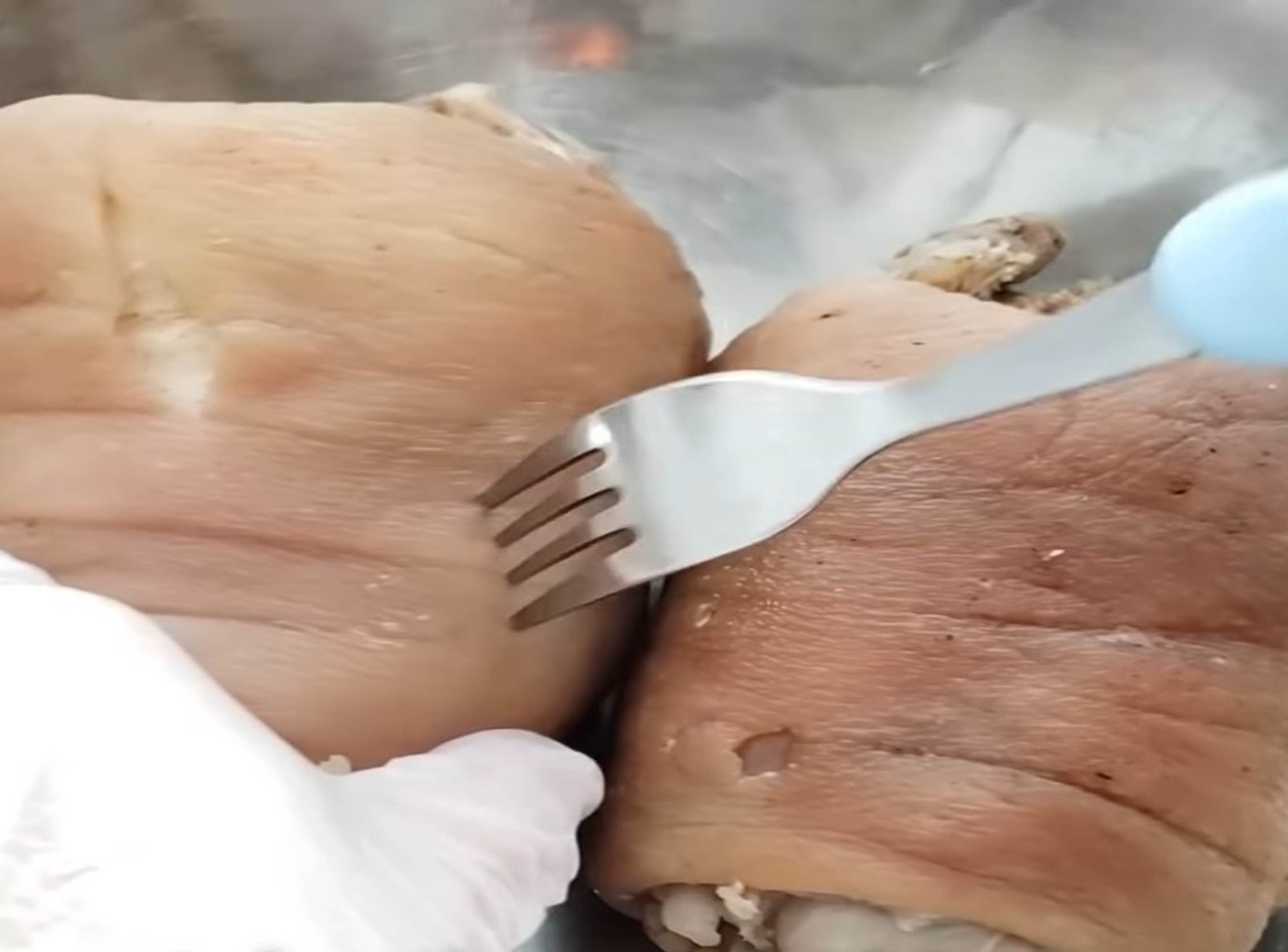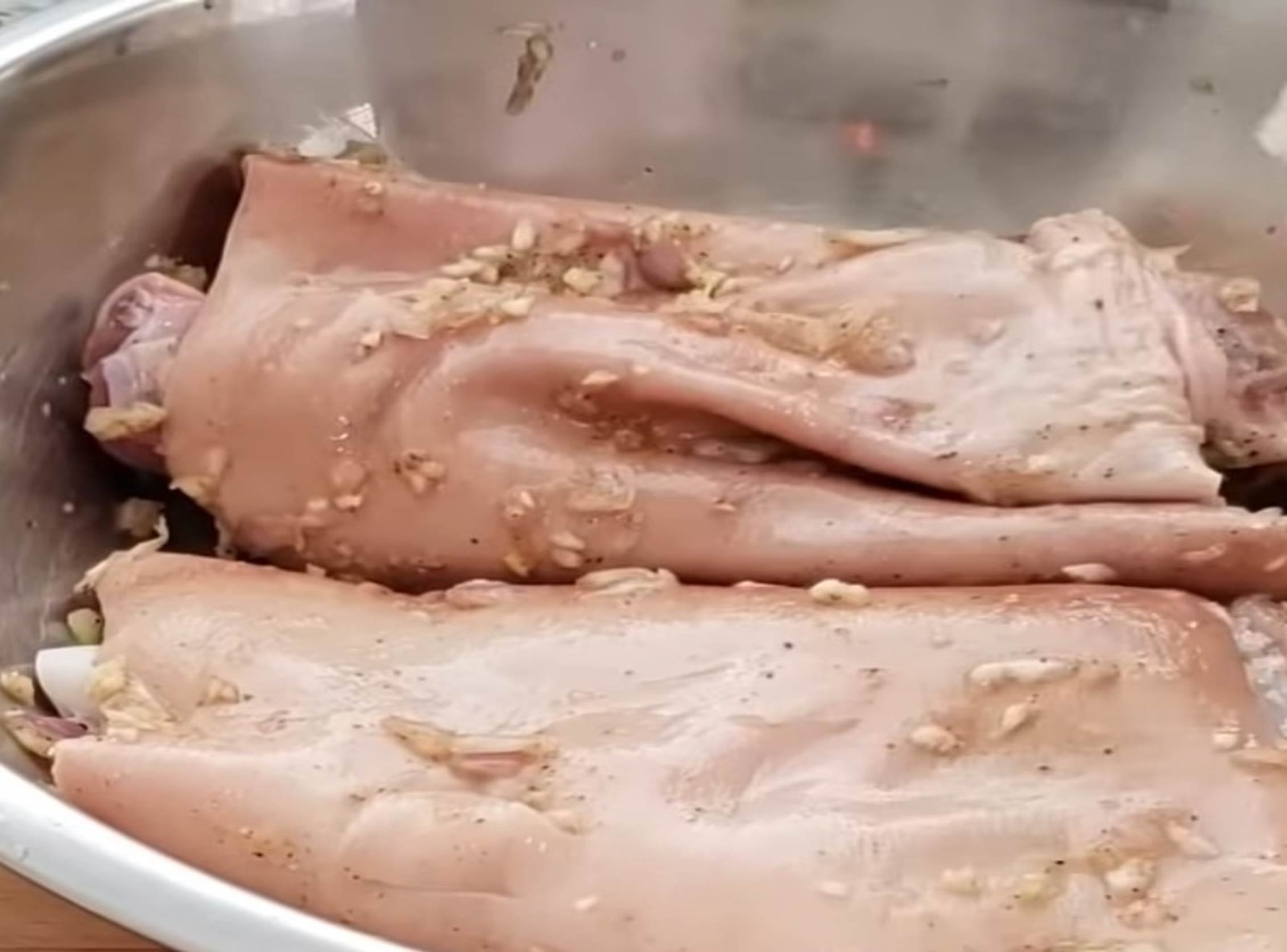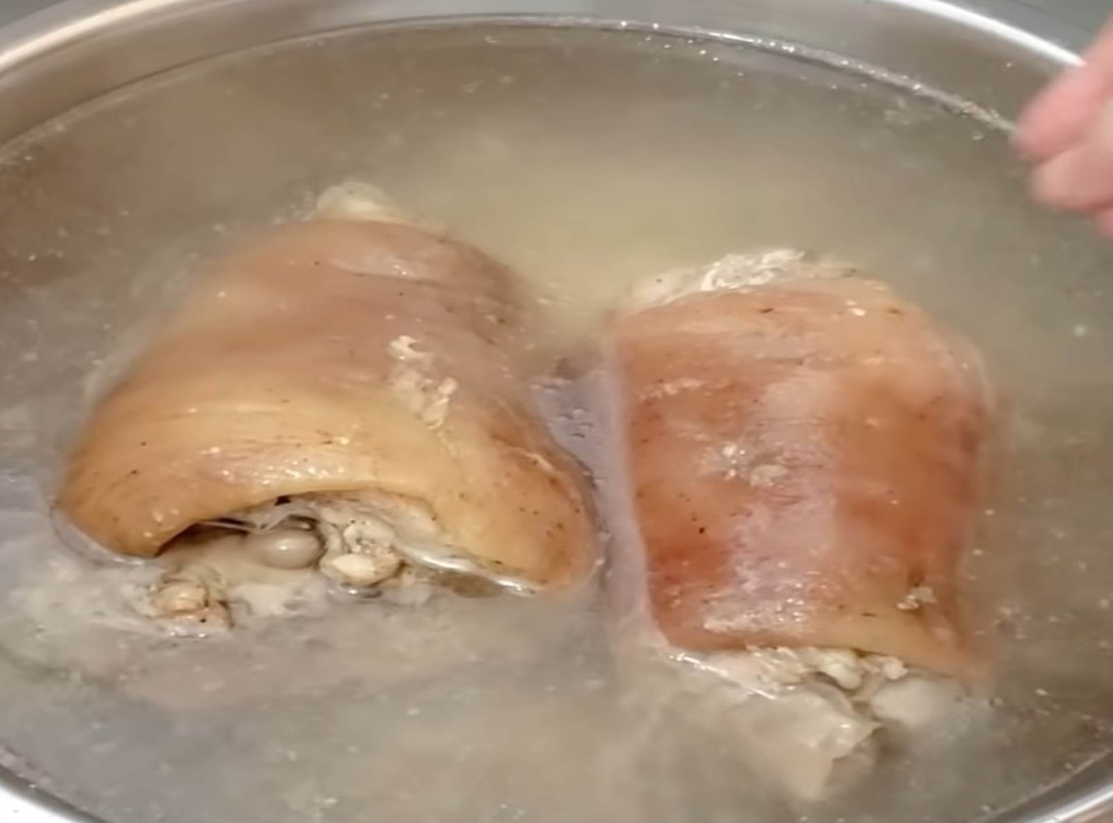 - Chân giò sau khi luộc chín, rửa sạch và lau khô, bạn dùng nĩa châm đều vào phần da rồi dùng khăn giấy thấm lần nữa cho ráo mặt.