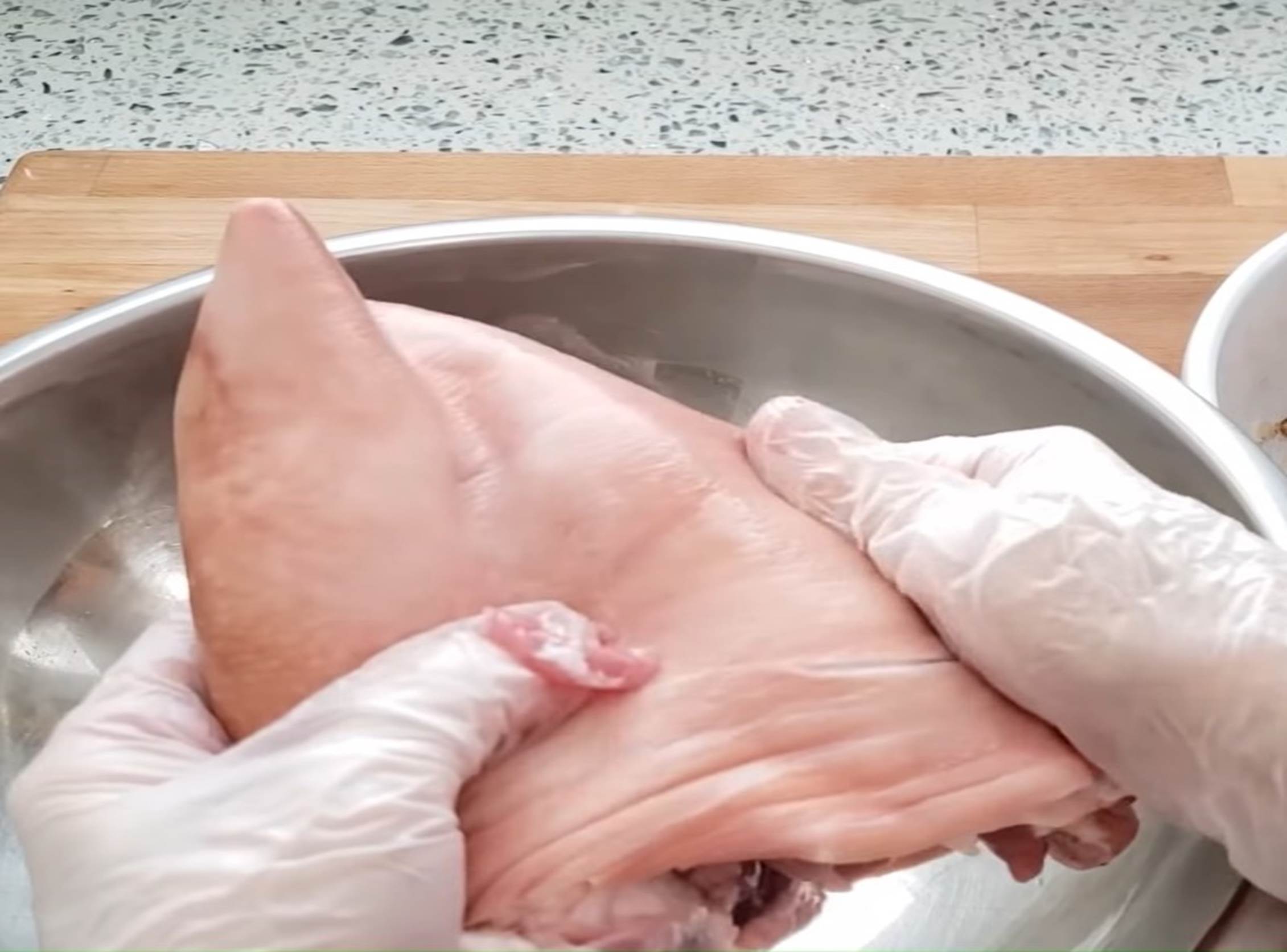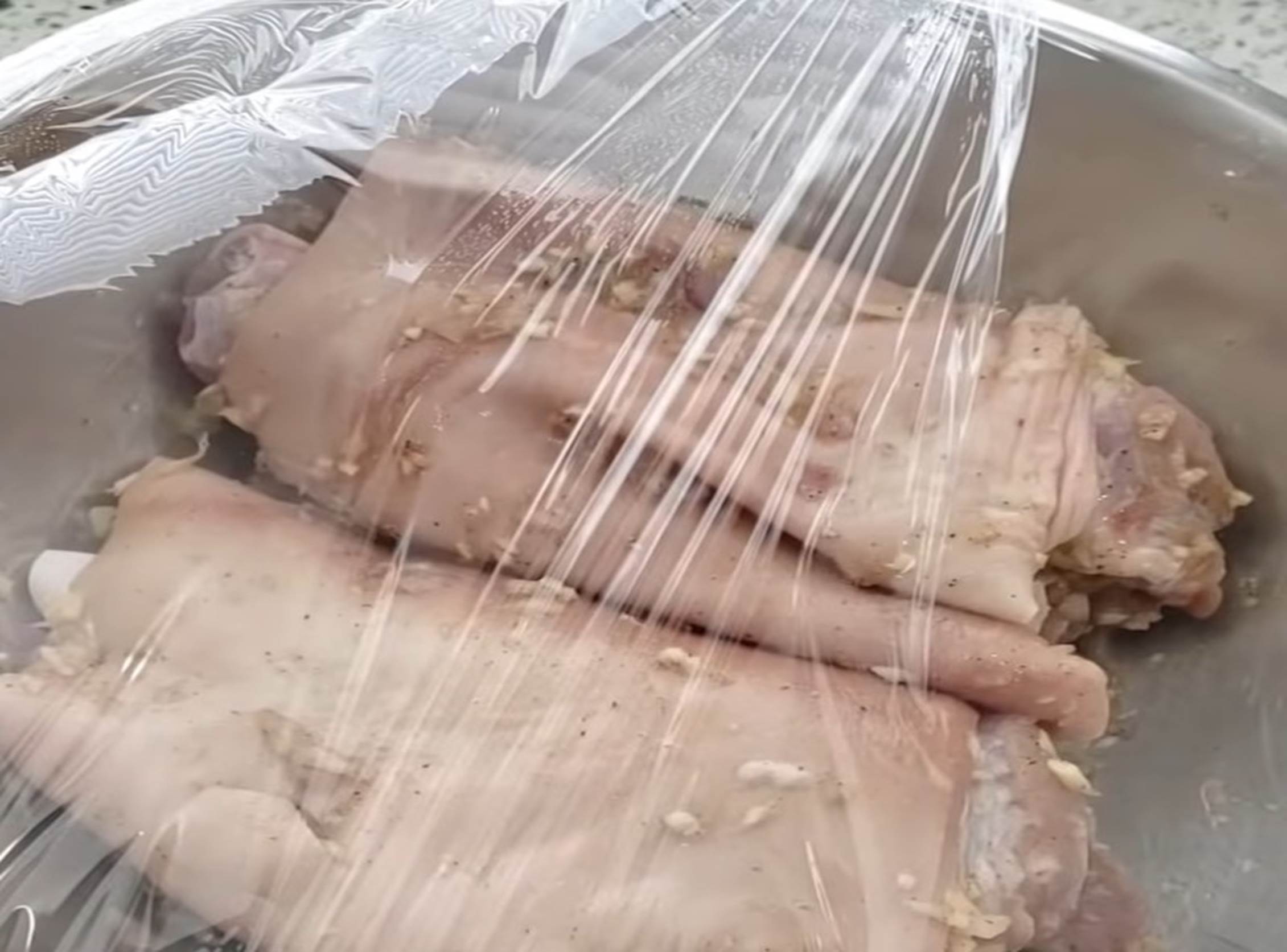 - Sau 40 phút, bạn gắp chân giò ra, tháo bỏ lớp giấy bạc và giấy nến rồi rửa sạch chân giò với nước lạnh rồi lau thật khô bề mặt chân giò.
