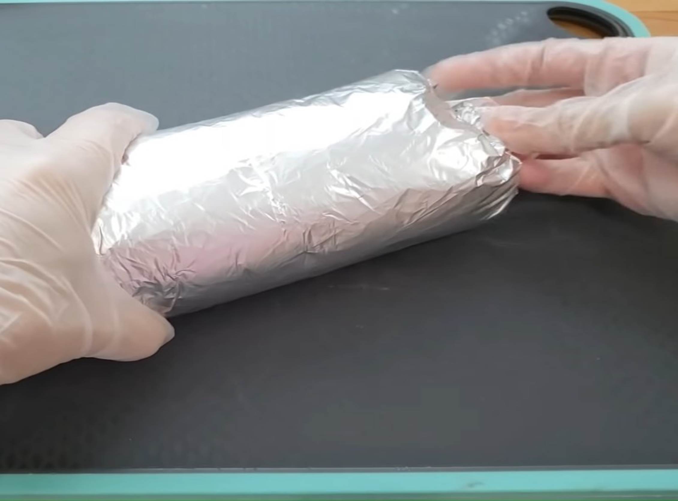 - Chân giò sau khi đã ướp ngấm gia vị bạn cho lên giữa tờ giấy nến, quấn thật chặt tay bọc kín phần chân giò. Sau đó, cho cuộn chân giò quấn giấy nến vào gói trong 1 lớp giấy bạc.