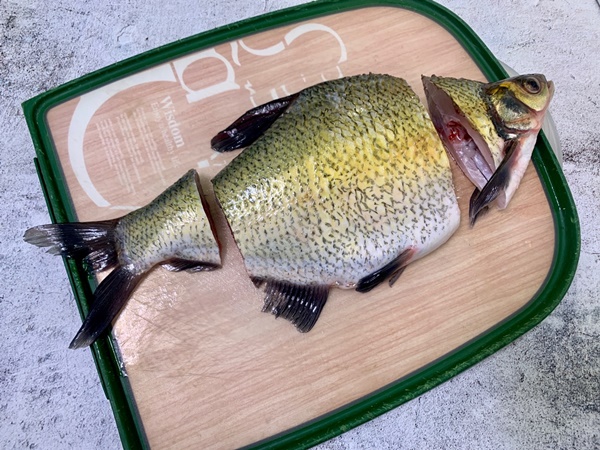 Bước 1: Cá tráp bạn mua về loại bỏ sạch vảy, mang và nội tạng. Lưu ý nếu bạn nhờ người bán hàng sơ chế thì khi về cũng cần rửa sạch loại bỏ huyết thừa và phần màng đen trong bụng cá. Tiếp theo bạn cắt phần đầu và đuôi cá rời khỏi thân.
