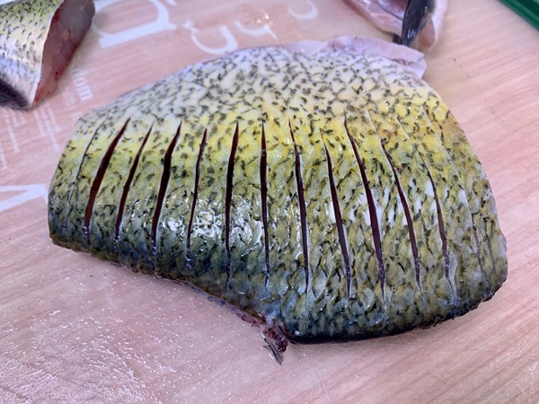 Bước 2: Kế tiếp bạn dùng kéo cắt bỏ phần vây lưng. Sau đó bạn dùng dao rạch các đường trên thân cá để đánh dấu sao cho thành từng lát có độ dày đều nhau khoảng 1cm. Lưu ý chỉ cắt kéo dài lên phần ngang lưng, còn phần bụng cá vẫn để dính liền.