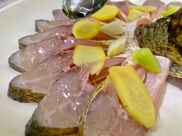 Bước 4: Sau khi cá đã ướp xong, bạn cho gừng thái lát (hoặc thái sợi cũng được) và hành lá xuống dưới đáy đĩa. Tiếp theo đặt đầu cá vào giữa đĩa, xếp phần thân cá xung quanh đầu cá, tạo thành hình tròn xòe như đuôi công. Sau đó trang trí bằng các khoanh ớt, hành lá và gừng thái lát lên trên. Tiếp đó bạn dùng thìa từ từ nhỏ dầu ăn lên trên bề mặt miếng cá để giúp kiểm soát vị ngọt và khóa ẩm khi hấp.