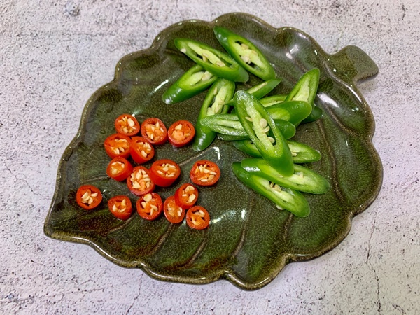 Bước 6: Cắt ớt xanh thành các lát xéo, ớt đỏ thành miếng tròn. Sau khi hấp cá xong bạn trang trí lên các miếng cá bằng cách đặt miếng ớt xanh ở phần sống lưng và đặt miếng ớt đỏ ngay bên dưới. Hành chẻ và cà rốt xắt nhỏ bạn rải lên phần bụng cá. Thêm một miếng ớt đỏ lên miệng cá. Hoặc bạn có thể trang trí tùy theo sở thích của mình, miễn sao phần tạo hình giống như đuôi của một con công đang xòe ra.