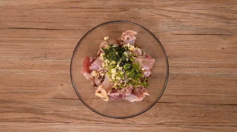 Thịt gà thái miếng vừa ăn rồi cho vào bát, thêm nước tương, dầu hào, nước mắm, dầu mè, hạt tiêu, sả, rau mùi, tỏi và lá chanh vào trộn đều. Ướp trong khoảng 1 giờ.