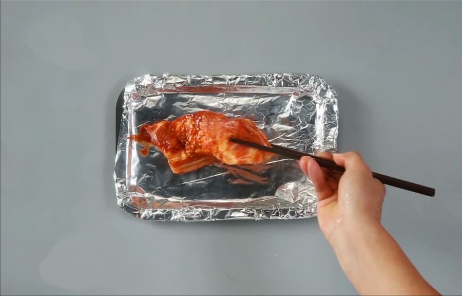 Bước 5: Thịt sau khi ướp thì đặt vào khay đã lót giấy nướng nhôm.