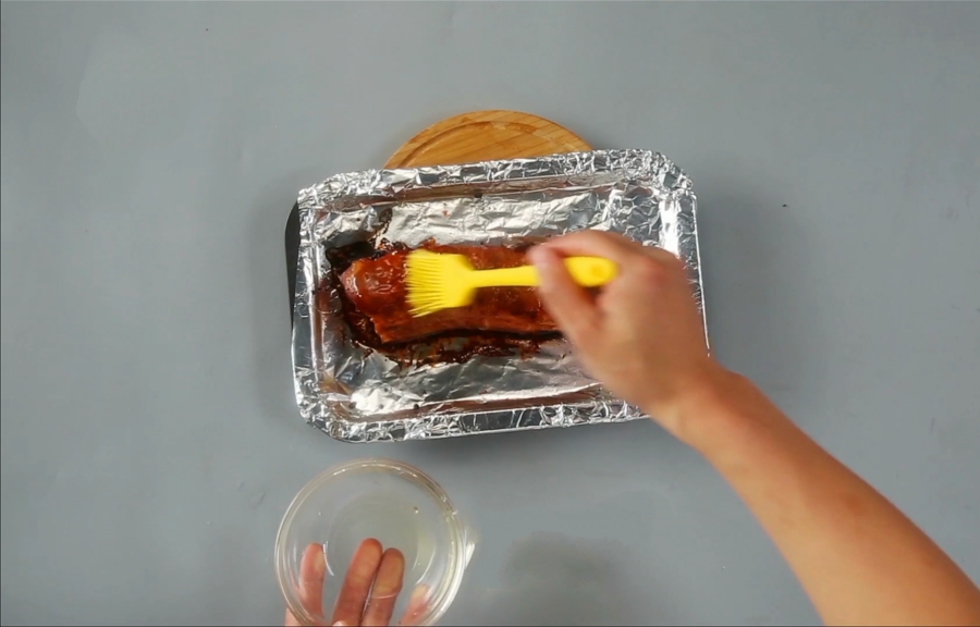 Bước 7: Sau đó gỡ giấy nướng nhôm mặt trên, dùng cọ quét một lớp mỏng mật ong lên miếng thịt.