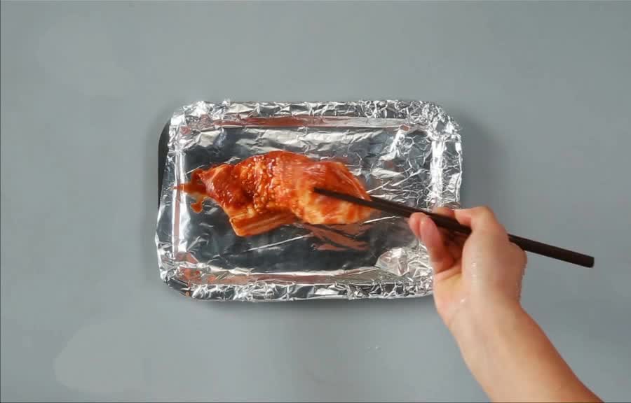 Bước 5: Thịt sau khi ướp thì đặt vào khay đã lót giấy nướng nhôm.