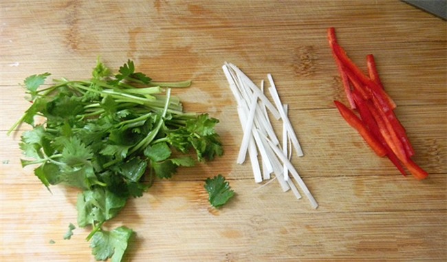 Rau mùi thái khúc, một phần gốc hành thái sợi, ớt sừng thái sợi.