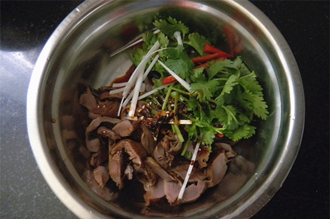 Cho mề gà vào âu, thêm rau mùi, gốc hành, ớt sừng, dầu ớt vào trộn đều là xong.