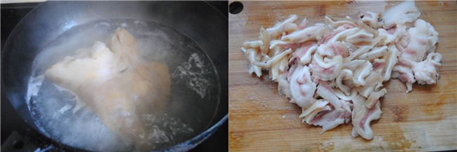 Tai lợn rửa sạch rồi cho vào nồi nước lạnh đun sôi 2 phút, vớt tai lợn ra rửa sạch. Thái tai lợn thành lát.