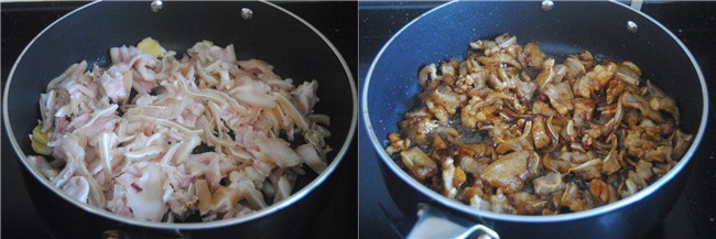 Cho một ít dầu ăn vào chảo, thêm gừng thái lát vào xào thơm. Tiếp đó đổ tai heo vào đảo chung, bạn thêm rượu nấu ăn vào đảo đều. Thêm nước tương, dầu hào vào đảo đều cho tai heo thấm gia vị.