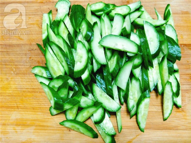 Dưa chuột đem rửa sạch rồi ngâm nước muối loãng 15 phút, vớt ra rửa lại cho sạch và để ráo nước. Cắt bỏ 2 đầu quả dưa chuột rồi chẻ làm đôi sau đó thái miếng vát chéo không quá dày cũng không quá mỏng. Nếu dưa chuột có nhiều ruột bạn nên khoét bỏ bớt để món nộm được giòn ngon hơn.