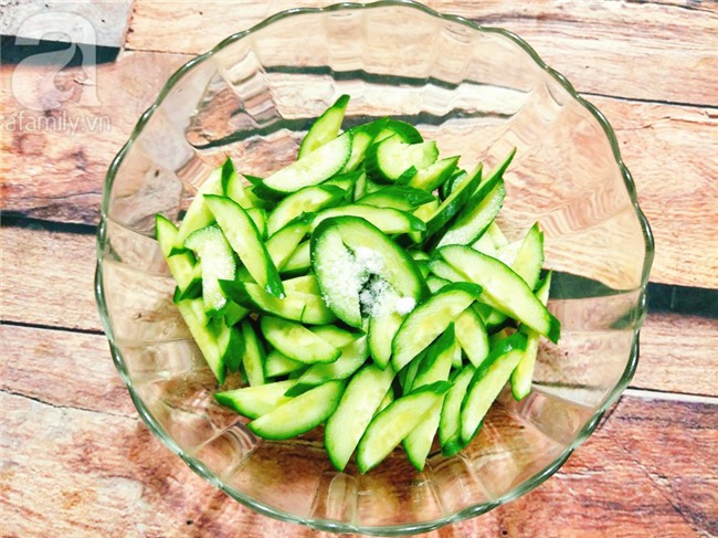 Cho dưa chuột vừa thái vào âu và thêm 1 chút muối, bóp nhẹ cho dưa chuột mềm và ngấm muối sẽ đậm đà hơn. Để khoảng 15 phút thì chắt bỏ nước dưa chuột chảy ra để món nộm được khô ráo và không bị ướt.