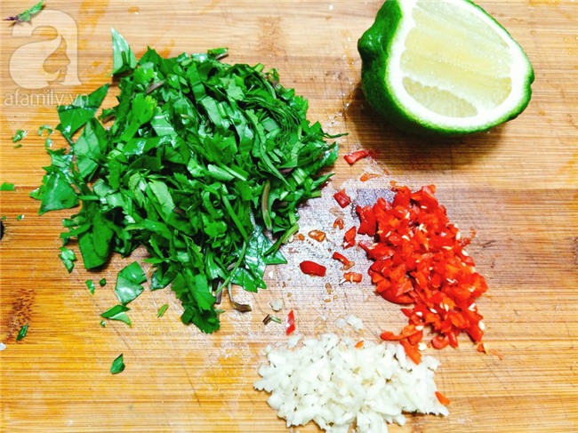 Tỏi, ớt băm nhỏ, rau mùi, húng quế rửa sạch để ráo nước rồi thái nhỏ. Chanh vắt lấy nước cốt bỏ hạt. Cà rốt gọt vỏ rồi đem bào sợi. Lạc bỏ vỏ rồi đem giã dập.