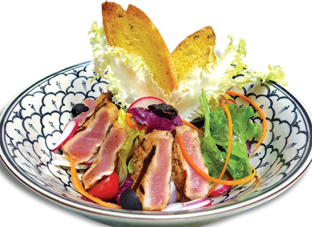 Xếp xà lách, cà chua, oliu, cà rốt, củ cải đường lên dĩa. Cho thịt nướng áp chảo lên trên.