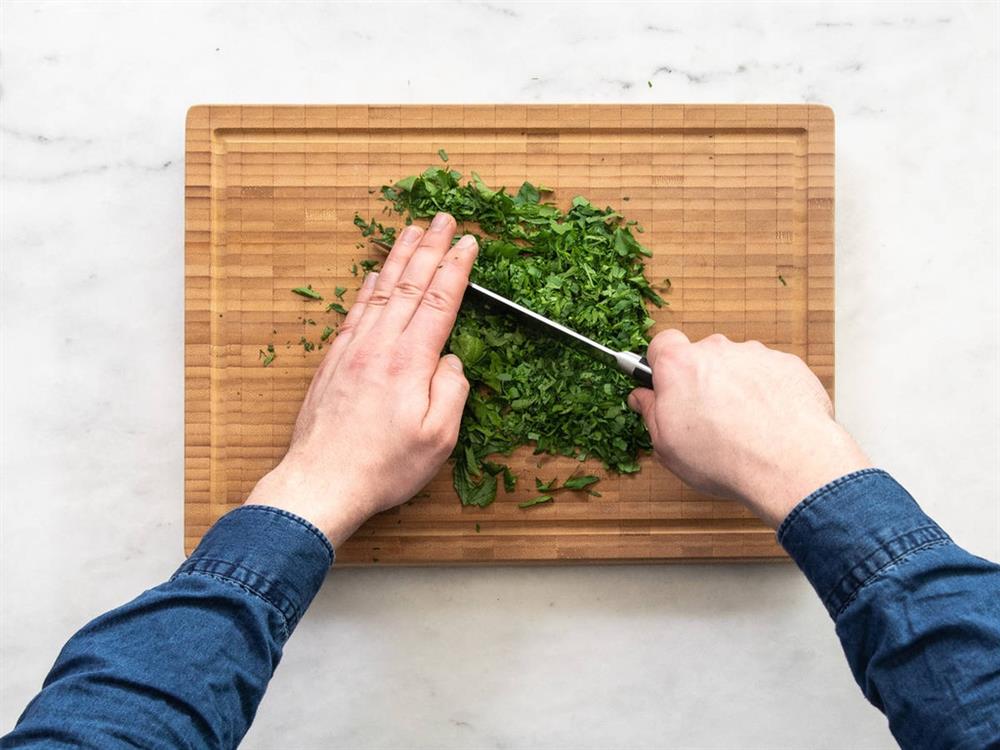 Băm nhuyễn ngò tây, cắt nhỏ tỏi, cắt đôi quả cà chua bi.