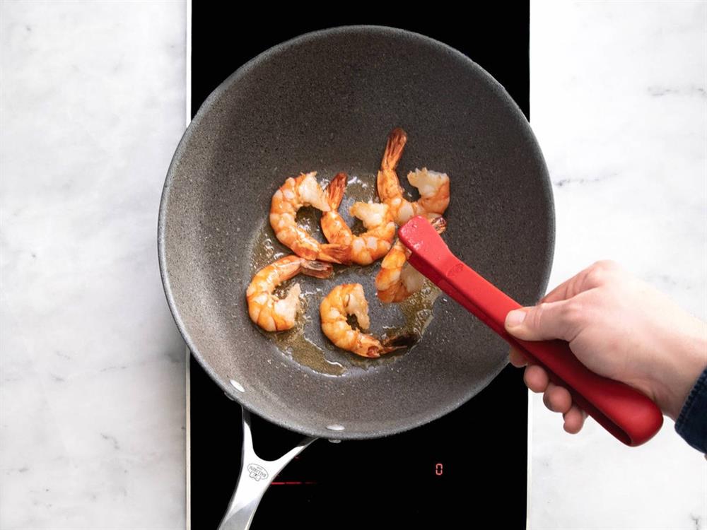 Đun nóng chảo lớn trên lửa vừa, thêm dầu thực vật và chiên tôm khoảng 2 phút rồi lấy ra khỏi chảo.