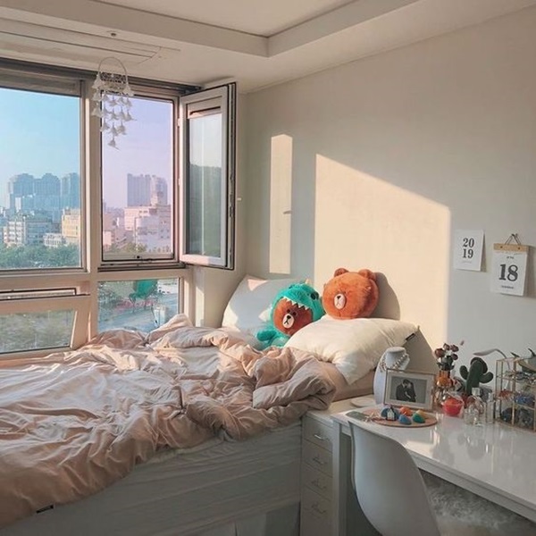 Một trong những điểm nổi bật của căn hộ phong cách Hàn Quốc là giường ngủ được đặt cạnh cửa sổ. Điều này sẽ làm cho bầu không khí rất thoải mái, đặc biệt là vào ban đêm. Lúc này, nếu cảm thấy buồn chán, bạn có thể ngắm nhìn quang cảnh thành phố từ bên trong căn hộ của mình, sẽ thúc đẩy tâm trạng tốt lên rất nhiều.
