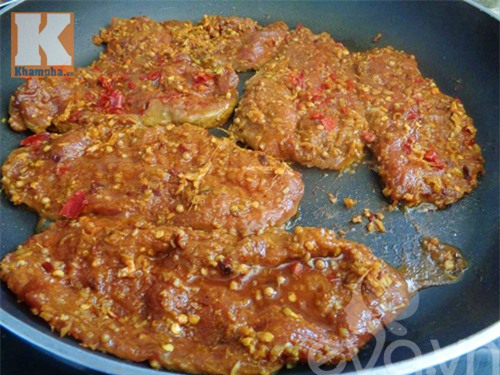 Bước 2: Bắc chảo lên bếp, xếp từng miếng thịt bò lên chảo rim với lửa nhỏ 5 phút cho nước trong thịt ứa ra.