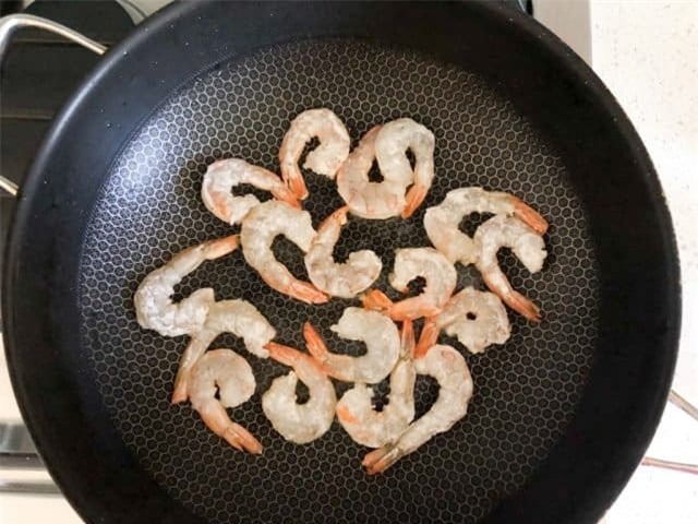 Đun nóng chảo, cho 1 muỗng dầu ăn vào láng đều mặt chảo. Cho tôm vào chiên vàng. Lưu ý cho cực ít dầu nhằm tránh cho tôm không bị cháy.