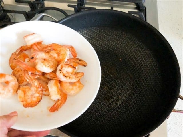 Nước sốt trộn đều với nhau sau đó đổ vào chảo tôm.