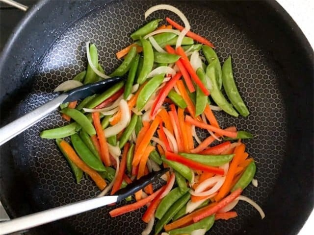 Vẫn trong chảo vừa dùng, thêm 1 muỗng dầu ăn, cho các loại rau củ vào xào.