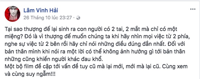 Chính Lâm Vinh Hải cũng chia sẻ đoạn phim này cùng dòng trạng thái nói lên quan điểm người thứ ba: "Tại sao thượng đế lại sinh ra con người có 2 tai, 2 mắt mà chỉ có một miệng? Đó là vì thượng đế muốn chúng ta khi hãy nhìn mọi việc từ 2 phía, nghe sự việc từ 2 bên rồi hãy chỉ nói những điều đúng đắn nhất. Đối với bản thân mình khi nói ra một lời có thể không ảnh hưởng gì tới bản thân những cũng khiến người khác đau khổ". Nhiều người thắc mắc, đó có phải lý do khiến nam vũ công im lặng dù từng tiết lộ biết mối quan hệ của vợ cũ với bạn thân từ một năm trước khi ly hôn?