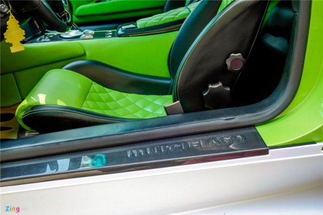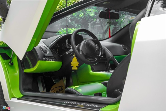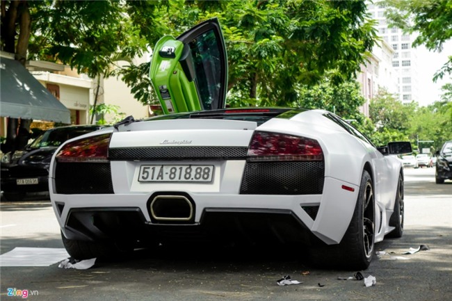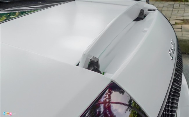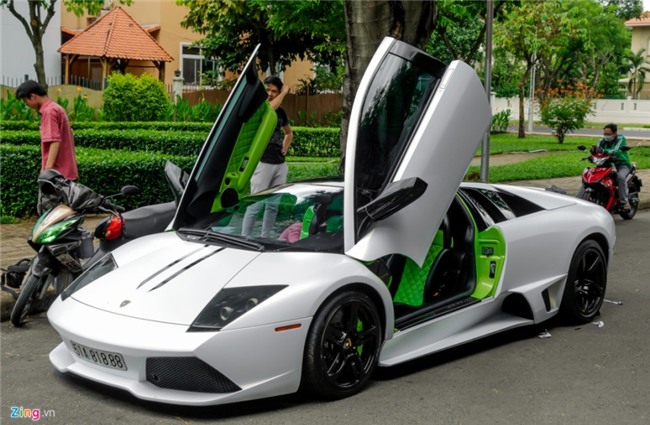 Đây là chiếc Lamborghini Mucielago LP640 màu xanh cốm duy nhất Việt Nam nhưng đã đổi thành màu trắng bằng cách dán decal. Sau khi được dán lại, xe mang phong cách của chiếc Gallardo Performante với hai sọc đen trên nắp ca-pô. |