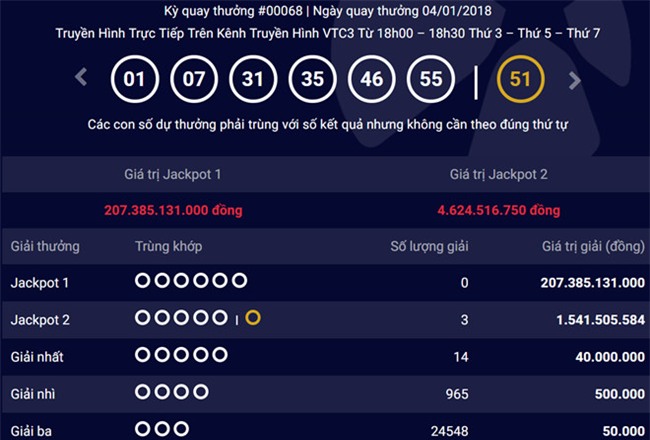Ngoài 3 giải Jackpot 2 trị giá 1,5 tỷ đồng mỗi giải, kỳ quay 68 của loại hình xổ số tự chọn này còn ghi nhận 14 giải nhất (40 triệu đồng/giải), 965 giải nhì (500.000 đồng/giải) và 24.548 giải ba (50.000 đồng/giải).