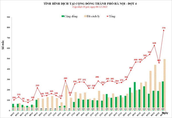 Ngày 6/12, Trung tâm kiểm soát bệnh tật (CDC) Hà Nội cho biết, trong ngày, thành phố phát hiện thêm 774 ca mắc Covid-19 , trong đó, 280 ca cộng đồng, 343 ca ở khu cách ly và 151 ca ở khu phong tỏa.