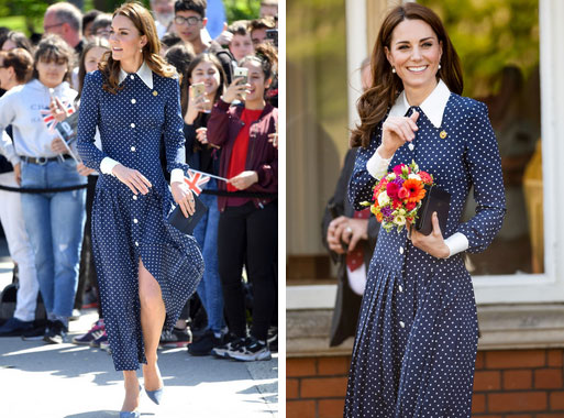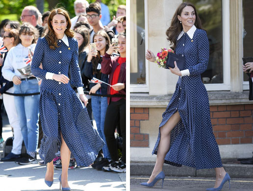 Vẫn là sắc xanh navy làm chủ đạo, nhấn nhá họa tiết chấm bi sized nhỏ cùng chiếc cổ áo mang gam màu trắng, đậm chất cổ điển. Mẫu váy của Công nương Kate giống đến 80% thiết kế mà mẹ chồng của cô – Công nương Diana đã từng diện. Và để set trang phục thêm trọn vẹn thanh lịch, sang trọng và thời trang, Công nương Kate đã nhấn nhá cho bộ cánh đôi giày xanh biển nhạt cùng clutch xuyệt tông với chiếc đầm.