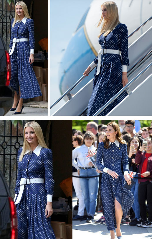Tuy nhiên thú vị hơn, chiếc đầm chấm bi đến từ thương hiệu Alessandra Rich này đã từng được diện bởi Ivanka Trump; và trong khi, Công nương Kate tối giản hóa phụ kiện thì Ivaka Trump đã tô điểm cho bộ cách một chiếc thắt lưng bản to, không chỉ tạo hiệu ứng "hack" dáng mà còn mang đến vẻ hiện đại cho set đồ.