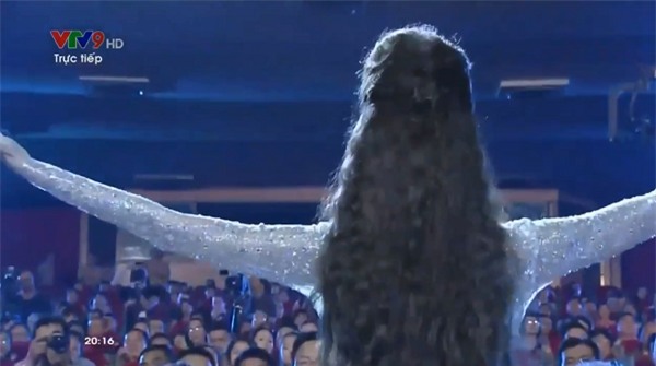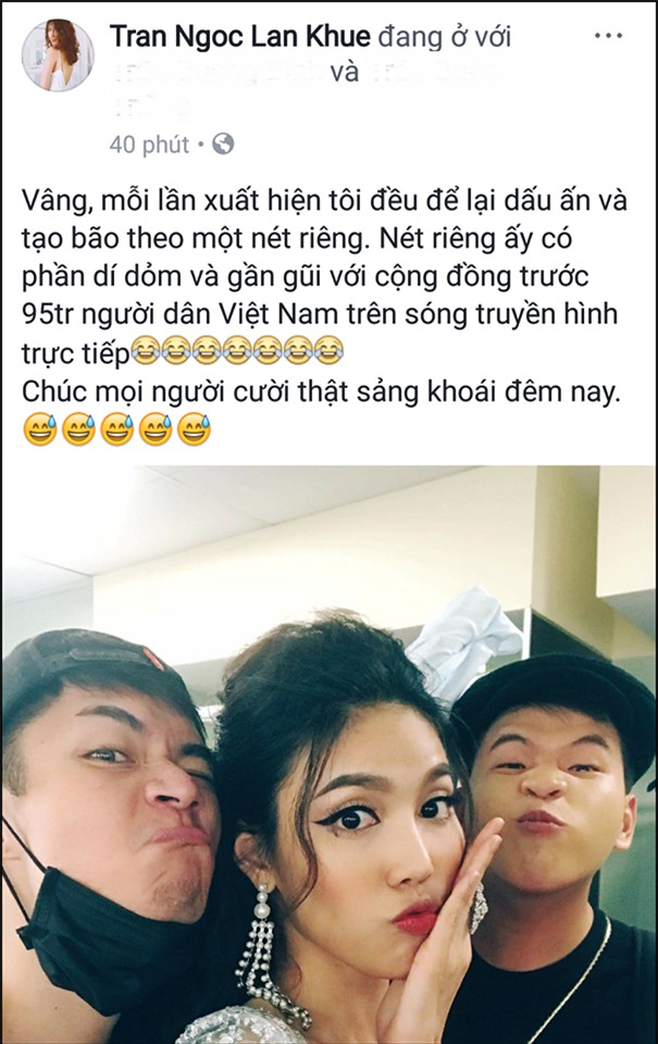 Trên trang cá nhân, người đẹp hài hước viết: "Vâng, mỗi lần tôi xuất hiện đều để lại dấu ấn và tạo bão theo một nét riêng. Nét riêng ấy có phần dí dỏm và gần gũi với cộng đồng trước 95 triệu người dân Việt Nam trên sóng truyền hình trực tiếp. Chúc mọi người thật sảng khoái đêm nay".