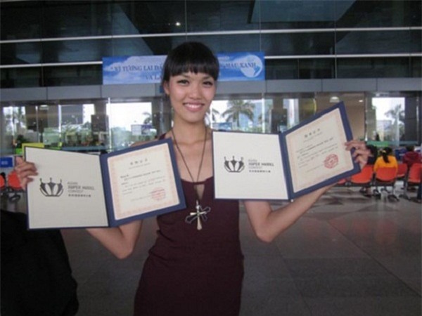 Lan Khuê khoe chứng nhận giải thưởng của cuộc thi Siêu mẫu Châu Á 2012. Tuy gương