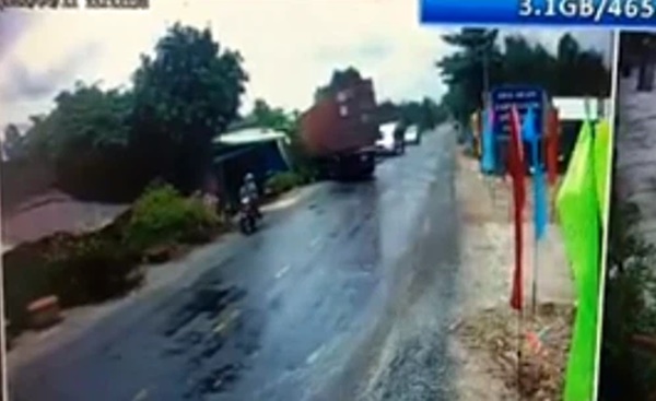 Thế nhưng, lúc này khi thấy chiếc ô tô khách đang lưu thông theo hướng ngược lại chạy tới, tài xế container đã phanh gấp và đánh lái vào lề đường bên phải, suýt chút nữa va chạm với xe máy.