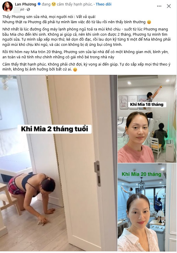 Theo đó, nữ diễn viên viết: "Thấy Phương sơn sửa nhà, mọi người nói: Vất vả quá! Nhưng thật ra Phương đã phải tự mình làm việc đó từ lâu rồi nên thấy bình thường.