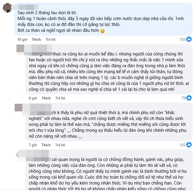 Một tài khoản bình luận: "Sau sinh 2 tháng lau dọn là bình thường. Mỗi người 1 hoàn cảnh thôi, đây 5 ngày đã vào bếp cơm nước dọn dẹp nhà cửa rồi. 1 mình mấy đứa con, không có ai đỡ đần thì cố gắng tự lực thôi. Bớt ca thán và nghĩ ngợi sẽ nhàn đầu hơn."