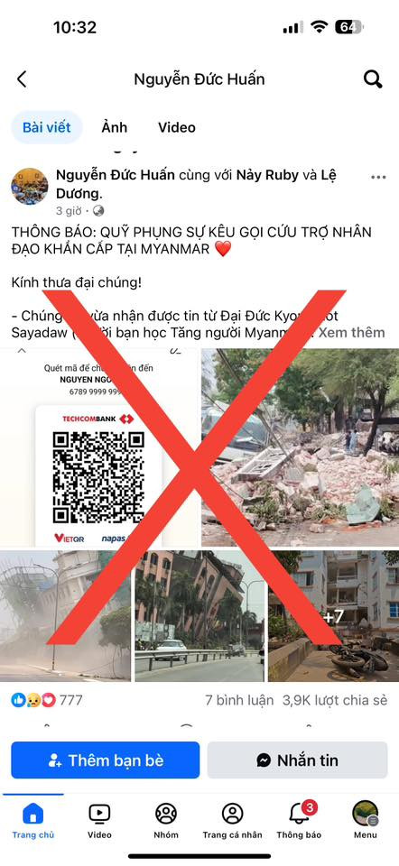 Một chi tiết đáng ngờ khác đó là sau khi bài đăng trên được chia sẻ khá nhiều, tài khoản “Nguyễn Đức Huấn” đã đổi nội dung sang thông báo nhận “Quỹ phụng sự kêu gọi cứu trợ nhân đạo khẩn cấp tại Myanmar”. Các hình ảnh cũng được thay đổi sang cảnh đổ nát sau động đất tại đất nước này. Kèm theo đó là số tài khoản, mã QR tài khoản nhận tiền cứu trợ.