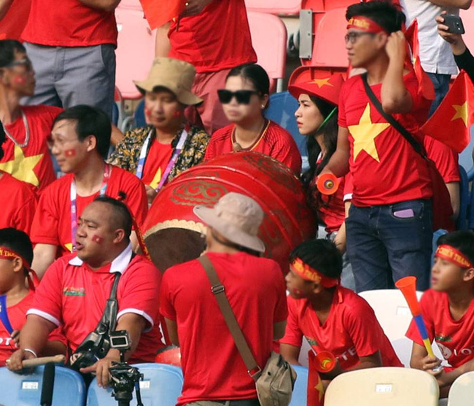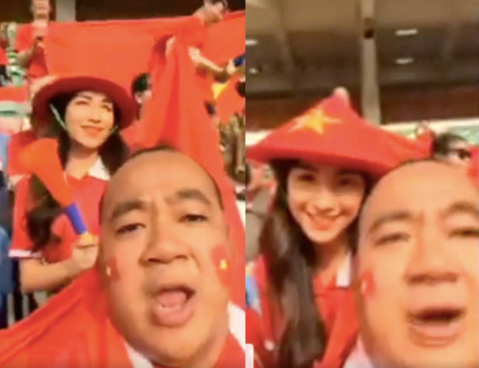 Chỉ ít phút sau đó, nữ ca sĩ vui như trẩy hội, vừa thổi kèn vừa nhảy múa tưng bừng khi bạn trai cũ sút tung lưới đối thủ và giúp Việt Nam vươn lên 3 - 0 trước Olympic Pakistan.