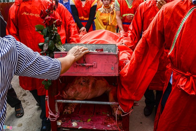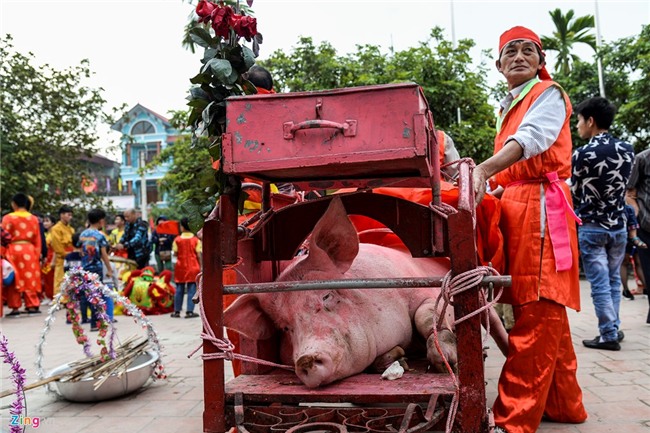 | 8h sáng, nghi lễ rước lợn quanh làng trước giờ chém tế thần. Trước đó nhiều tháng, dân làng đã chọn những con lợn giống và người chủ hợp tuổi, có gia cảnh tốt để giao nhiệm vụ chăn nuôi, chờ đến ngày khai đao. Do tôn thờ ngày lễ long trọng này, người dân gọi con lợn là "ông ỉn". |