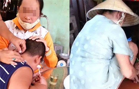 Nói xong, bà đem viên thuốc màu đen bỏ vô ly nước trà, đưa cho đứa bé uống. Sau đó, mặc cho đứa bé sợ, khóc la hét, van xin, bà này dùng một mảnh lưỡi lam đè đứa bé, cắt liên tiếp ba nhát phía sau cổ đến rướm máu, rồi cắt thêm một nhát nữa tại chỗ đứa bé bị vết răng cắn. Xong bà vô nhà, lát sau đem ra một loại thuốc lạ trông như đất sét có mùi hôi (do cơ sở này tự bào chế - PV) bọc vô mảnh vải rồi cột lên chỗ các nhát cắt, dặn sau 25 phút tháo ra, sau đó về nhà đắp thêm ba lần nữa là chắc ăn khỏi bệnh.