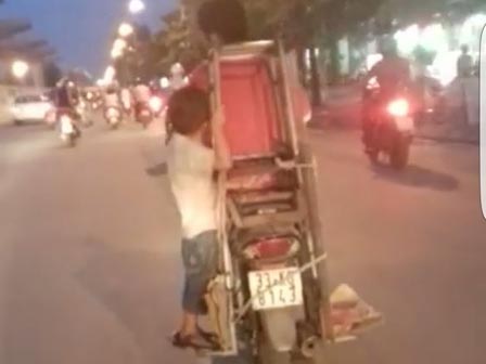 Anh Khoa chia sẻ, bé trai bám đu vào chiếc khung gỗ được buộc cố định ở yên xe. "Tôi đã cố gắng phóng theo sau nhưng người đàn ông này đi khá nhanh. Thỉnh thoảng, anh lại ngoái đầu nhìn lại bé trai phía sau".
