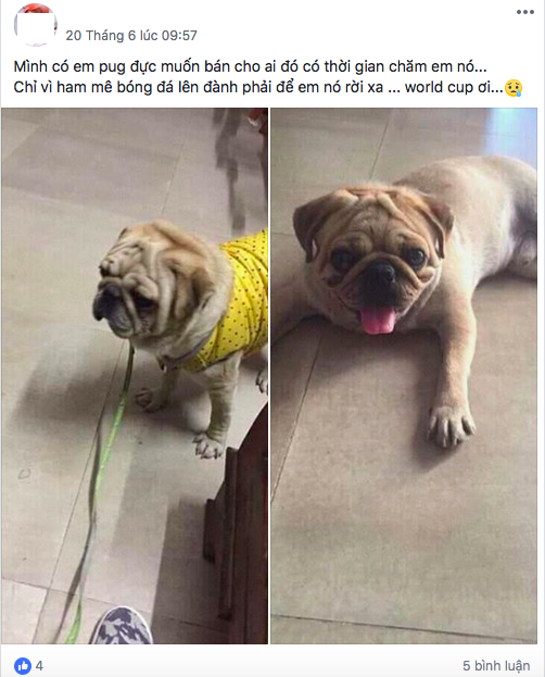 Truy cập vào các hội yêu chó những ngày này, không khó để đọc được những dòng trạng thái kiểu như: “Mình có em Pug đực muốn bán cho ai đó có thời gian chăm em nó. Chỉ vì ham mê bóng đá nên đành phải để em nó rời xa…World Cup ơi…!”