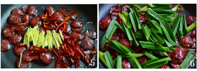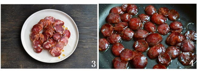 Thái lát lạp xưởng, đun nóng dầu ăn trong chảo cho lạp xưởng vào xào chín.