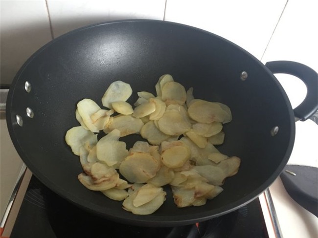 Lạp xưởng cho vào nồi hấp khoảng 20 phút. Lấy lạp xưởng ra thái lát; khoai tây bào vỏ thái lát. Cho khoai tây vào chảo xào.
