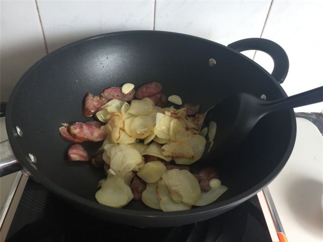 Cho một ít dầu ăn vào chảo, thêm tỏi vào xào thơm rồi cho lạp xưởng và khoai tây đã xào chín vào đảo chung. Thêm nước tương, muối vào đảo đều cho thấm gia vị.