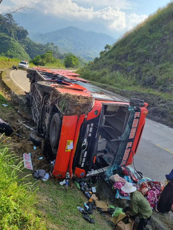 Khi đến Km 1396 + 300, đoạn qua thôn 3 (xã Phước Mỹ, huyện Phước Sơn, Quảng Nam), xe khách bất ngờ bị lật nghiêng bên đường.