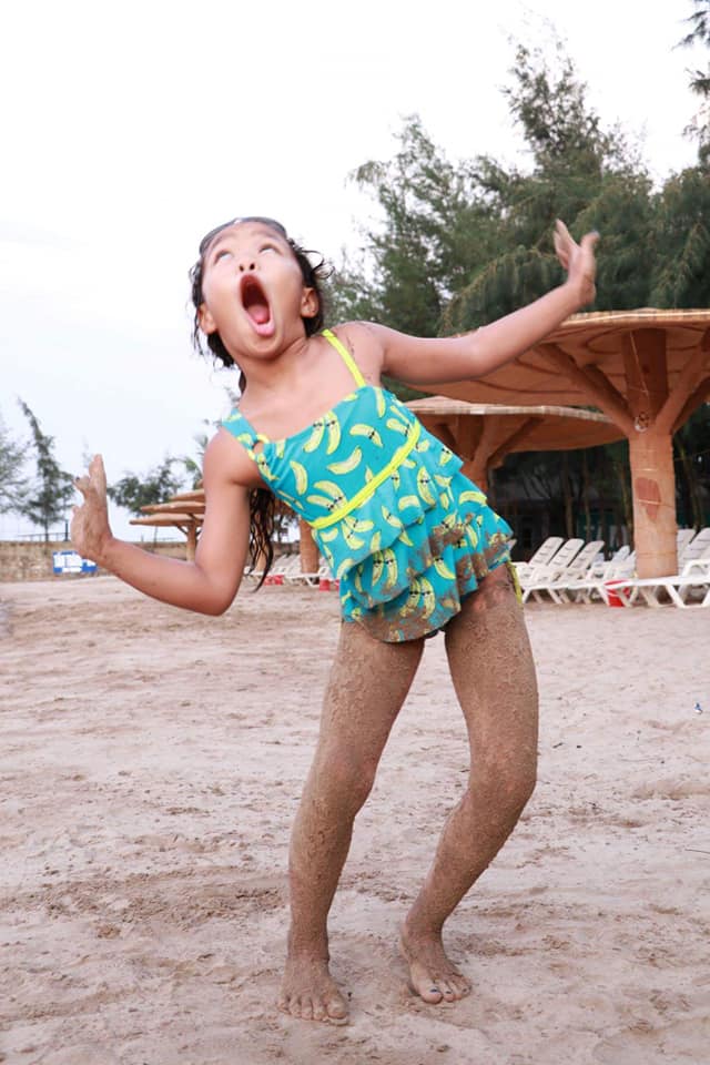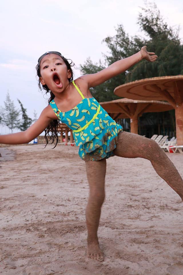 Việt Hương vui vẻ chia sẻ: "Cùng một bãi biển hai vợ chồng chụp hình lãng mạn, trong khi con gái lãng xẹt". Nàng "công chúa nhỏ" siêu nhắng của Việt Hương khiến fan phì cười vì tạo hình bá đạo. Nhiều người còn nhận xét đây đúng là "phiên bản nhí" của Việt Hương và cho rằng cô bé có tố chất hài giống mẹ.
