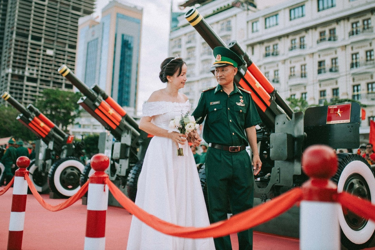 Mới đây, bộ ảnh cưới bất ngờ được nhiều diễn đàn mạng xã hội chia sẻ kèm theo dòng chú thích: “Anh bảo vệ Tổ quốc, em làm hậu phương vững chắc cho anh".