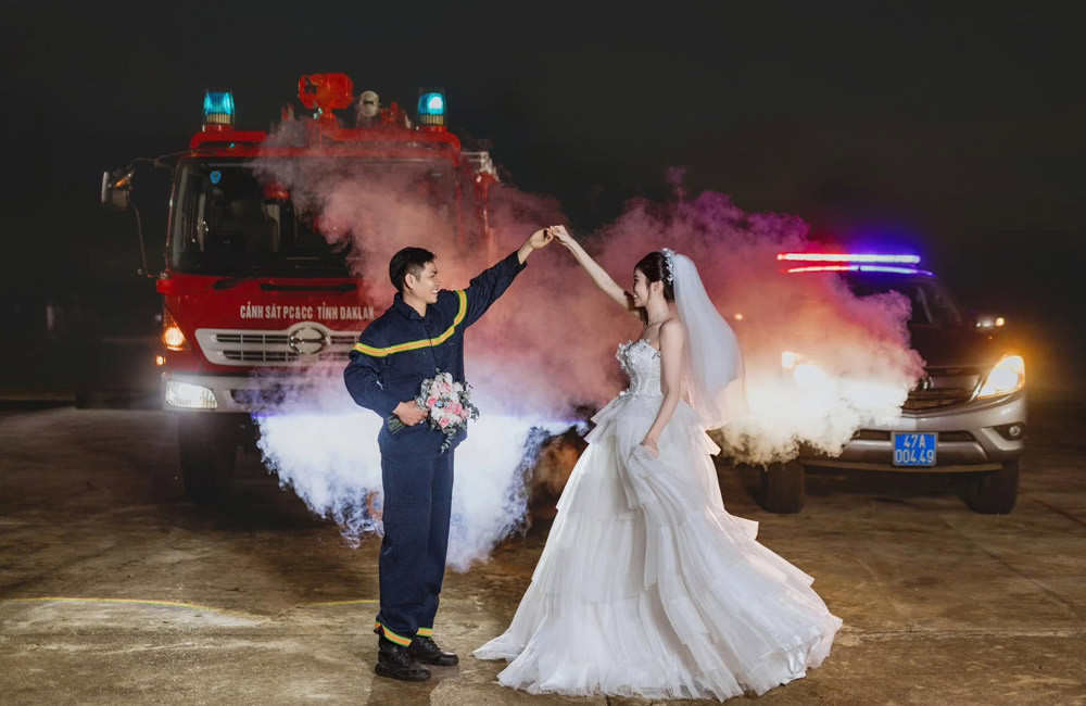 Để buổi chụp hình thành công, cặp đôi phải chuẩn bị khá nhiều. Văn Anh mượn máy phun khói của bạn, máy phun nước và xe cứu hỏa của cơ quan. Anh còn đặc biệt nhờ các đồng nghiệp hỗ trợ cho buổi chụp hình.